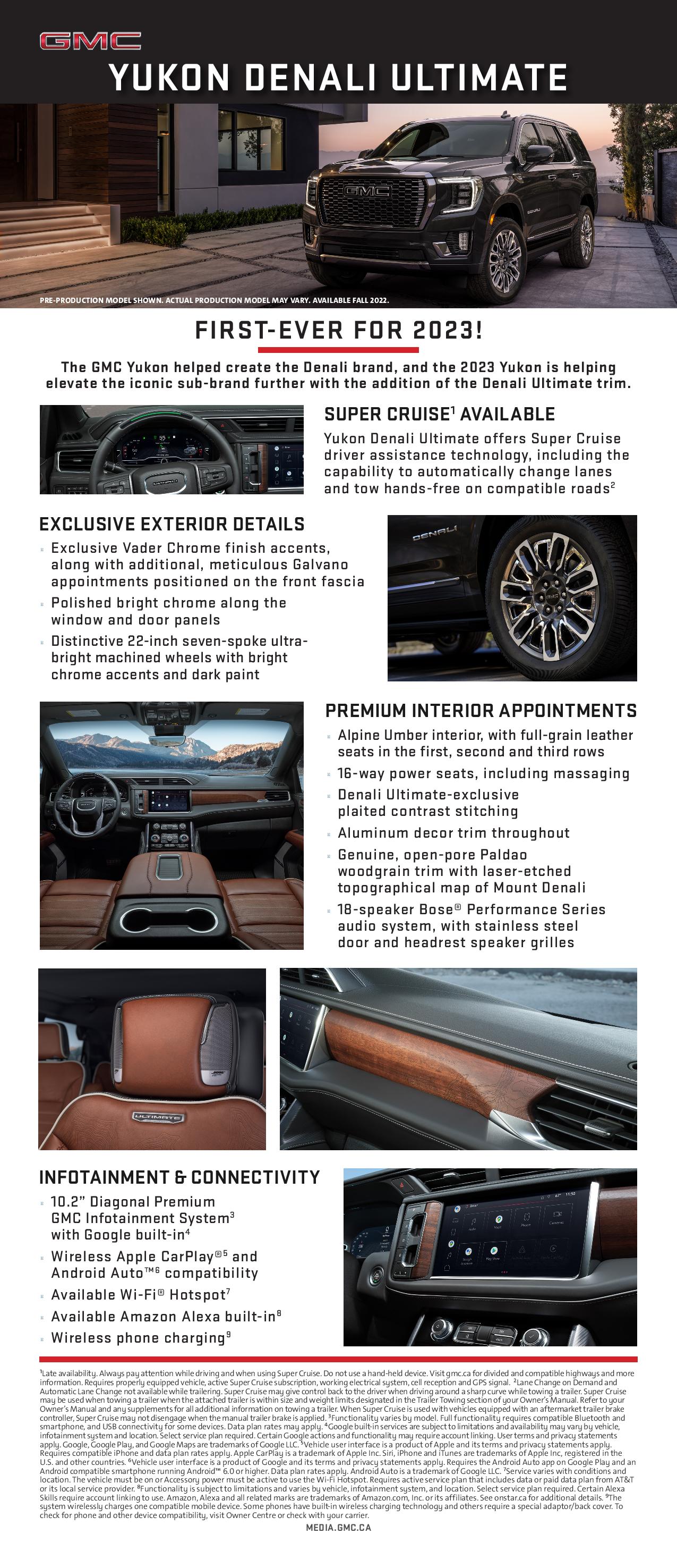 Distinguished with exclusive exterior and interior details, next-level materials, innovative available technologies and impressive capability, the new 2023 Yukon Denali Ultimate is the most premium Yukon ever offered.